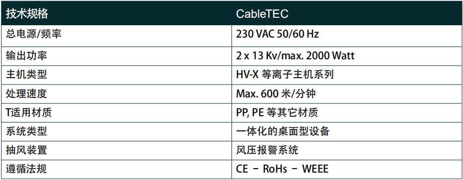 CableTEC is a unique and cost-effective method to improve and enhance the surface energy of modified polymer cables, insulators (PE, PP, PTFE) and extruded tubes, thereby optimizing and promoting inks, glues or layers on the surface of materials Of adhesion.