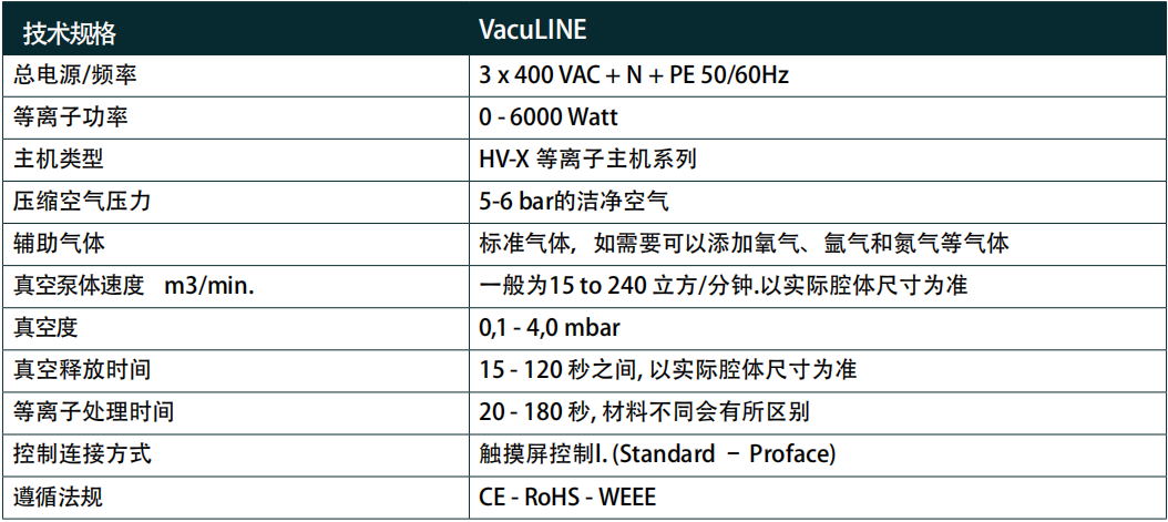 VacuLINE vacuum plasma processing line has the advantages of simple operation, reliable production and fast processing speed. Auxiliary gases such as argon and oxygen can be added during the process to improve the surface treatment effect, but in most cases, because high-power plasma discharge generally does not require gas to assist in participation.